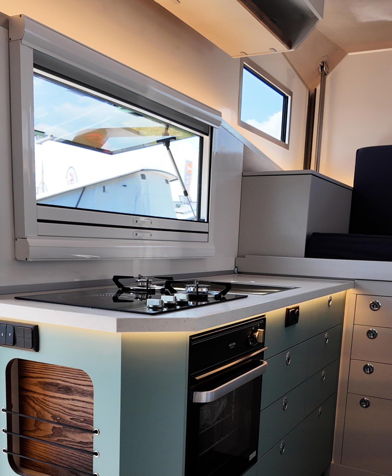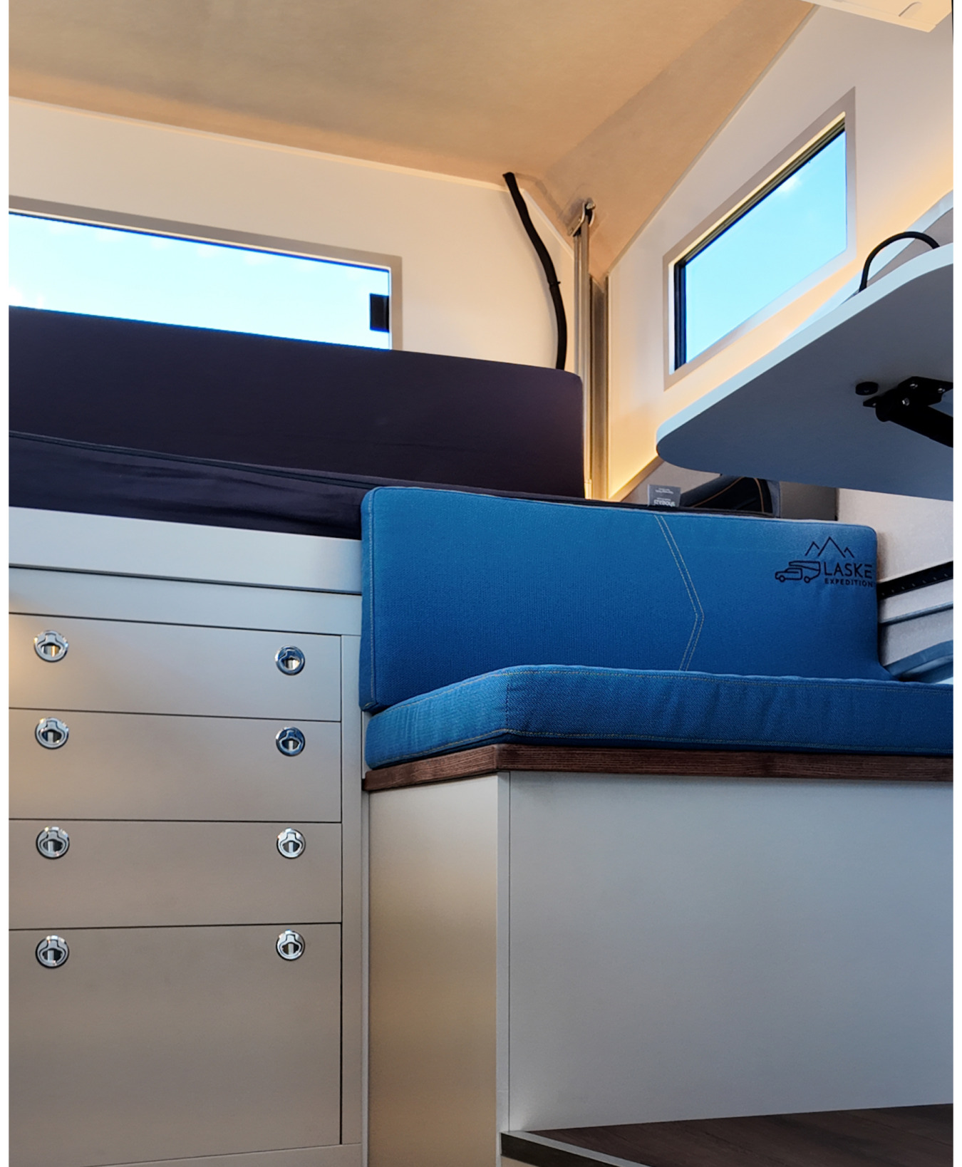 Ce qui distingue cette cabine, c’est l’équilibre entre la durabilité, le confort et la fonctionnalité. La construction de haute qualité offre un espace de vie bien pensé avec un espace de couchage, une cuisine et des installations sanitaires, adapté à la vie sur la route pendant de longues périodes. Chaque cabine est personnalisée en fonction du style de voyage et des destinations de son propriétaire.