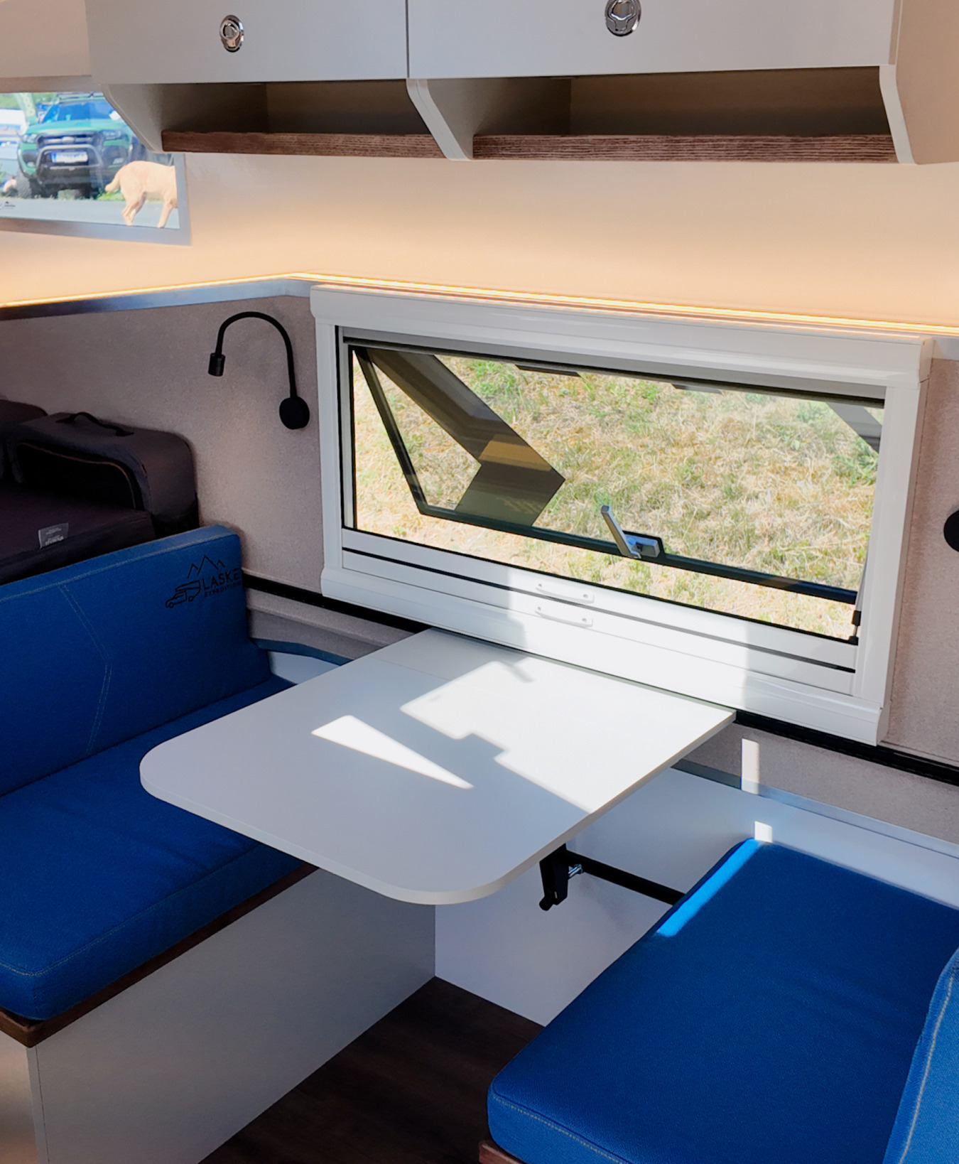 L’une des principales caractéristiques de cette construction est le toit à levage parallèle, qui permet au véhicule de rester compact pendant la conduite et qui crée une garde au toit et un espace de vie supplémentaires lorsqu’il est garé. Ce design améliore la poignée tout-terrain sans compromettre le confort intérieur.